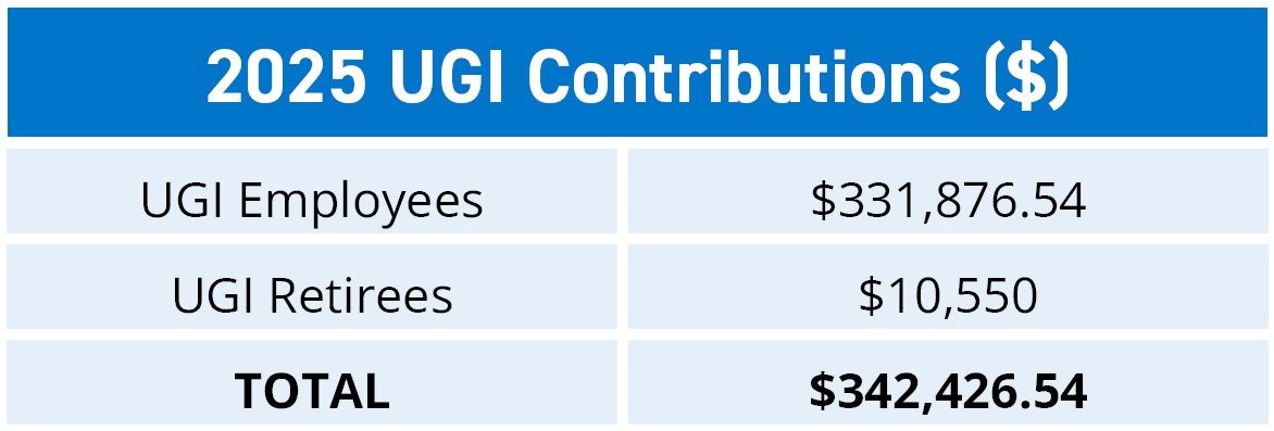 During this year’s Employee Giving Campaign, pledges to United Way organizations in our service area, consisted of $331,876.54 from UGI Employees and $10,550 from UGI Retirees – totaling $342,426.54.